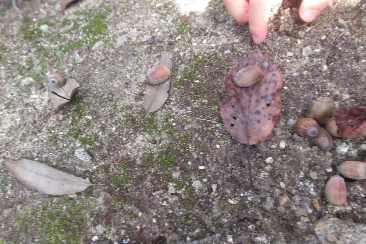 すると、拾ったどんぐりを落ち葉の上に乗せて遊び始めました。「これはなあに?」と保育者が聞くと、「イチゴのケーキだよ」「これはブルーベリー!」と目を輝かせて嬉しそうでした。いくつもケーキを作り、「なにケーキがいいですかー?」「ぶどう!」「いちご!」などと、ケーキ屋さんごっこの始まりです。落ち葉からどんぐりが転がっていかないように気をつけながら「どーぞー」「ありがとう」と、友達とのやりとりを楽しんでいました。
