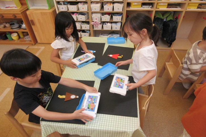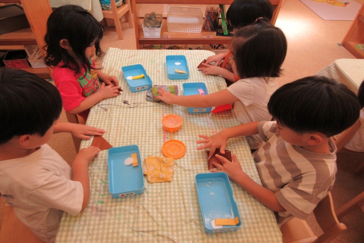 また、折り紙が大好きな子が多く、折り紙でのおばけ作りも楽しんでます。「怖い目にするんだ~」「わたしはピンクのかさおばけにしたよ」とオリジナルのからかさおばけを友達同士で見せ合っていました。