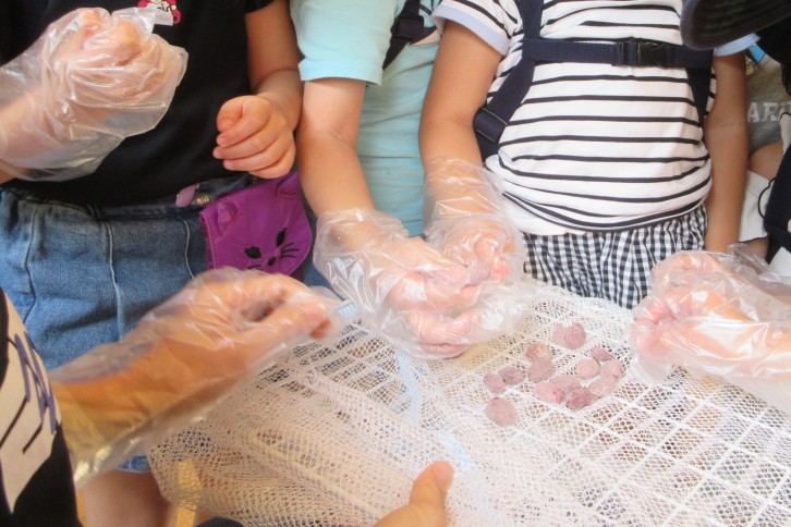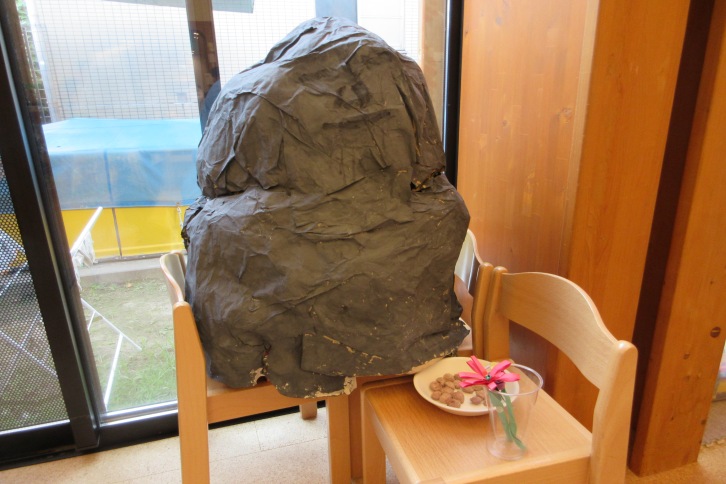 みんなで実際に触ってみると、「かたいね」「まだ干しておいたほうがいいんじゃないかな?」という意見が…。一週間ほど干してみたのですがやはり柔らかくならず、「もしかしたらかたい梅干しなのかな」「かたくてこれは食べられないかも…」という話になりました。そこで、お地蔵様に興味を持った子どもたちの提案で作ったお地蔵様にお供えすることにしました。「お地蔵様もかたくて食べられないかも…。でもお地蔵様は石だから食べられるかな?」と心配しながらもお供え物を添えるとより一層お地蔵様に愛着がわいたようで、「みんなのこと見てくれてるね」とつぶやく子もいました。