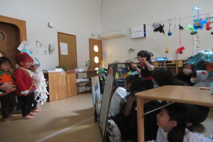 「あんまり怖くないお化け屋敷で…」というリクエストされた乳児クラスでは「ハッピーハロウィン!」と言ったり、優しい声で「わぁ〜」と言ったりして怖さレベルを調整しました。一方、「怖いお化け屋敷で!」とリクエストした幼児クラスでは思いっきり脅かしに行く子どもたち。「うううぅ…」とゾンビがうめいているような声や、保育室の玩具を活用して不気味な音も再現していました。