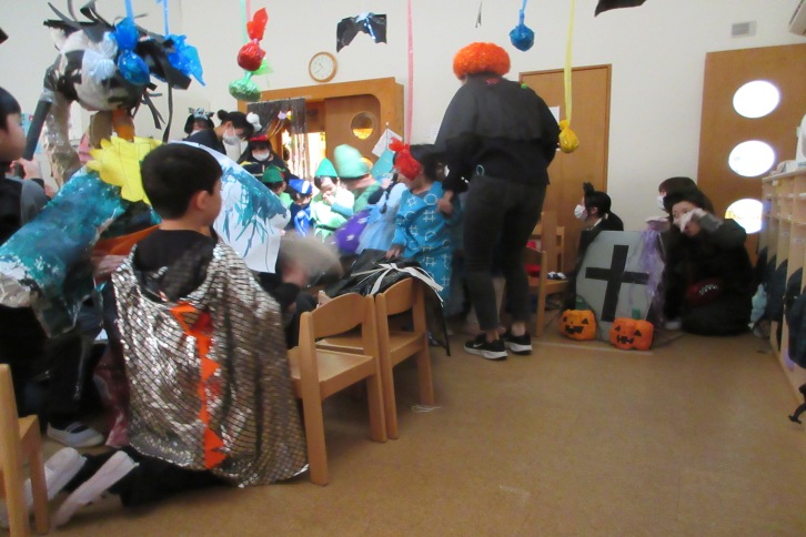 終わった後にいろんな職員から「すごく怖かった〜」と言ってもらえ、子どもたちも大満足。「泣いてる子もいたもんね」「ハロウィンあと2回くらいしたいな」と自分たちで作ったぞんびぱーくについて誇らしげに話す姿がありました。