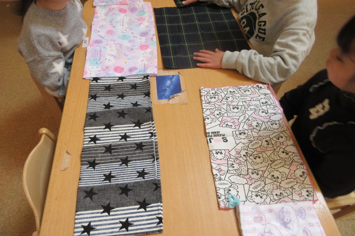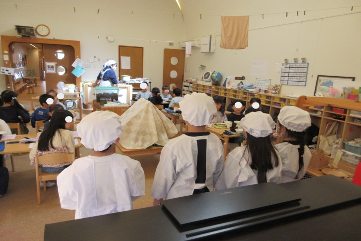事前にエプロンの着方、たたみかたを一緒に確認し、ついに給食の時間がやってきました。当番の子がエプロンを身に着けるのを興味津々の様子で見守り、待っている子たちも自分のナフキンを机に置いて準備をします。