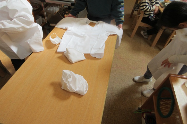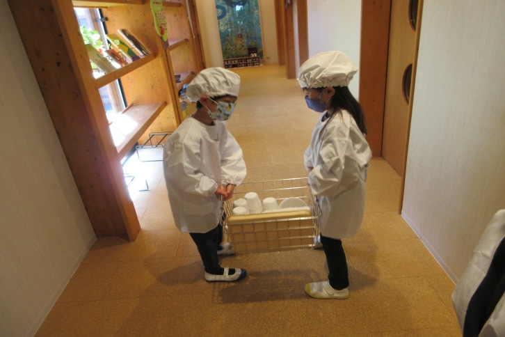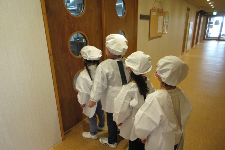 ぞう組の白衣と帽子を着用しての給食当番が始まりました。朝から「今日から給食当番だよね!」「小学校みたいだね!」と、心待ちな子どもたち。