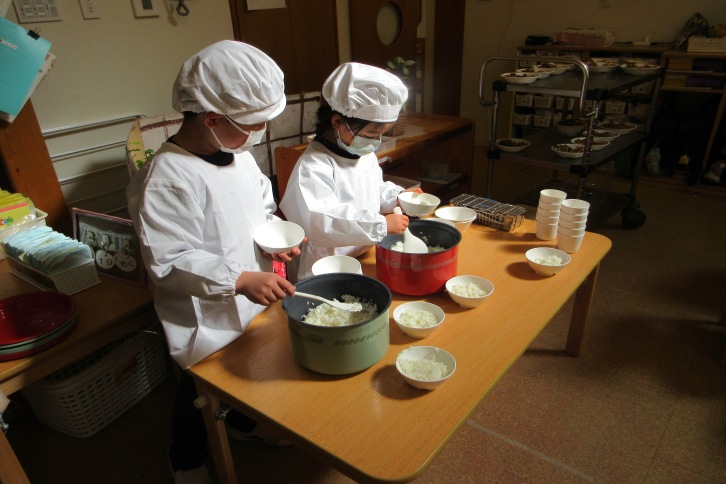 そして配膳開始!自分のグループだけに配っていた今までの配膳とは違い、クラス全員に配らなくてはいけないという使命感から真剣な表情で配膳を行っていました。また、ご飯の盛り付けにも挑戦。見本の量を見ながらお茶碗によそっていきます。最初は「こんな感じ?」「なんかご飯がくっつく…」と不安げな様子も見られましたが、慣れてくると集中して盛り付けていました。