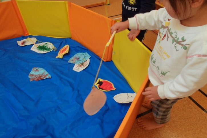 「おさかな!」「つり!」と興味津々で、磁石のついた手作りの釣り竿を持つと、真剣な表情になり、そっと魚に近付けます。