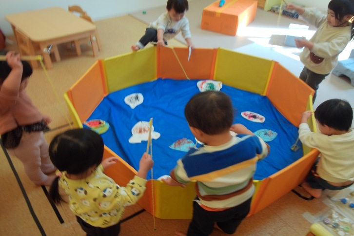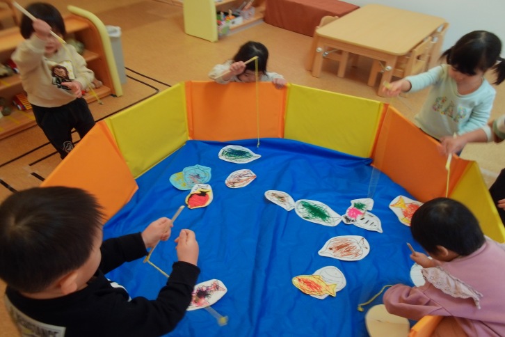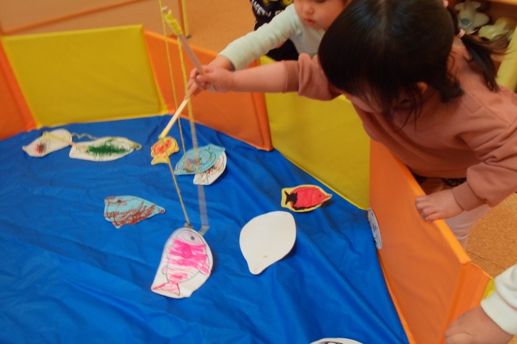 「とれた!!」「ぴんくのさかなだよ!」「たのしい~!」等と、釣れたことを嬉しそうに教えてくれる子ども達。釣り竿の先についた磁石同士がくっつくハプニングにも「あはは!くっついちゃった!」と笑い合っていました。