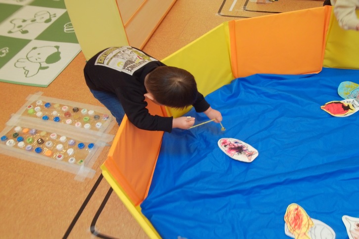そこで、保育室でもそのイメージを広げられるように花紙を丸めて袋に入れ、ペンで塗り、カラフルな魚を作りました。出来上がった魚をパタパタプールに入れると、魚釣り場の完成です!