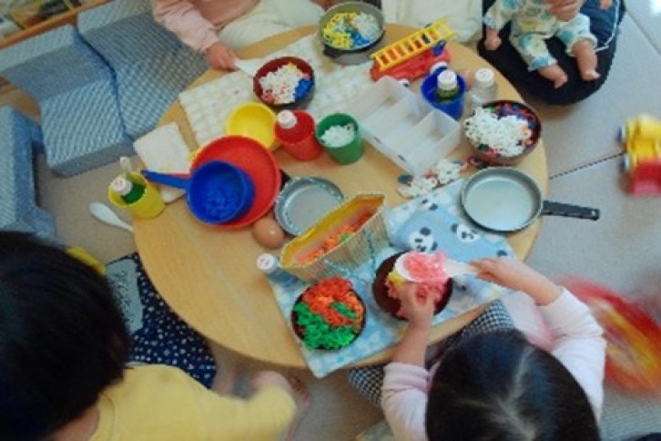 言葉でのやりとりが増えてきているりす組の子ども達。それぞれに遊びの中で自分の思いや経験したことを言葉やしぐさで表現して、再現遊びやごっこ遊びをしています。