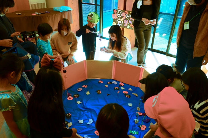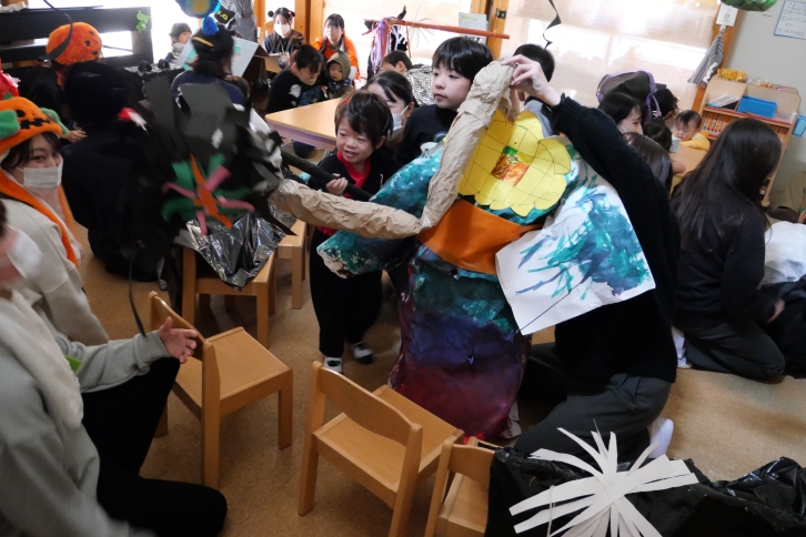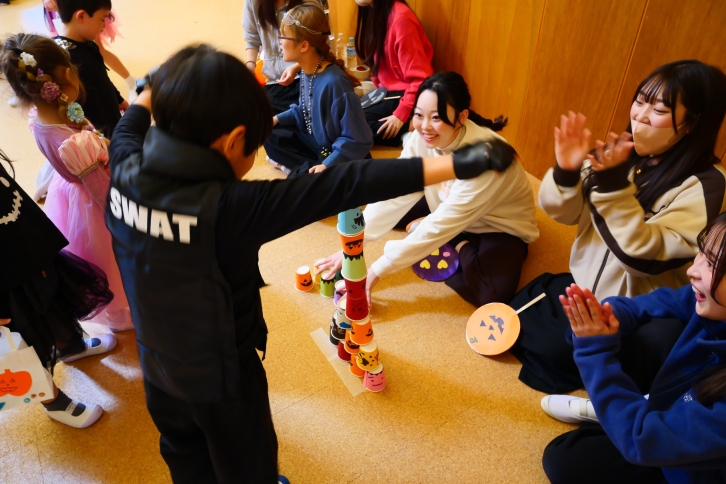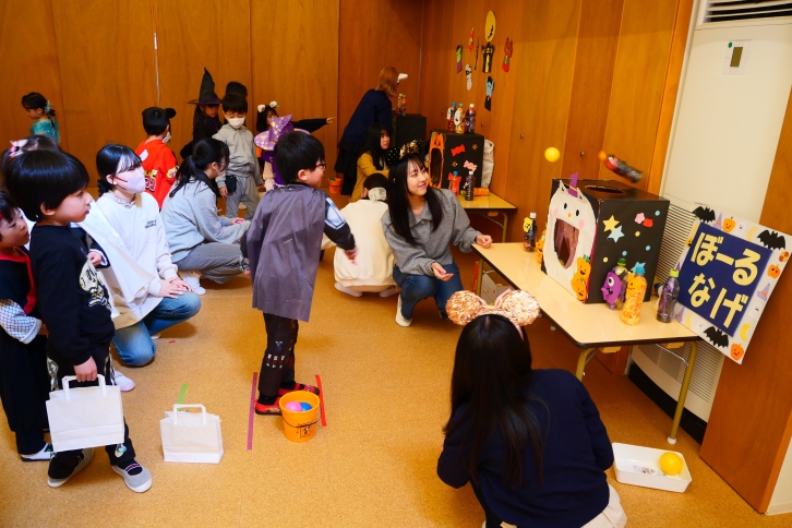 ハロウィンパーティーには、椙山女学園大学教育学部の学生も参加しており、学生たちは「ブラックライトシアター」「ハロウィンタワー」「ボール投げ」などのゲームや出し物の用意。また、子どもたちのサポートを行い、さらに園内を盛り上げていました。