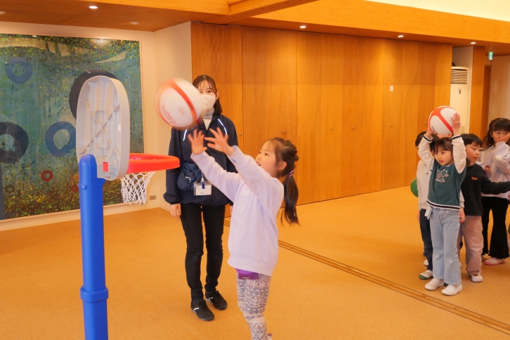 2月19日(木)、三井住友信託銀行様より、ミニバスケットゴールとボールを寄贈していただきました。園内のホールに設置されたゴールを前に、子どもたちは目を輝かせながらボールを手に取り、さっそくシュートに挑戦しました。