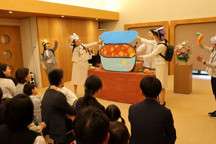 理事長祝辞・職員紹介の後には、職員からのプレゼントとして「カレーライス」の歌とお話を披露。園の畑で収穫した大きな野菜が登場する場面では、管理栄養士も一緒に歌に合わせてカレーライス作り。園児たちは野菜を指さしたり、歌を口ずさんだりしながら、楽しそうに見入っていました。