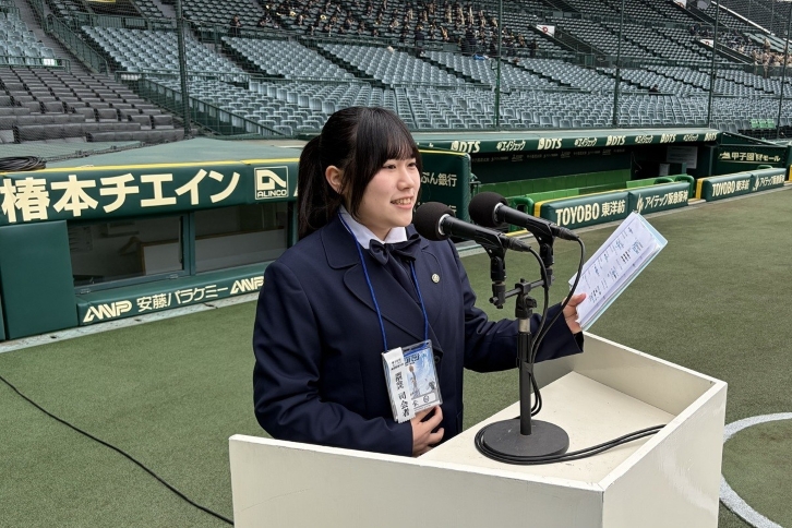 吉木さんは多くの観客と関係者が見守る中、よく通る声と確かな表現力で司会を務め、これまでの努力の積み重ねが感じられました。大役を終えた吉木さんは「甲子園には独特の雰囲気があり、グラウンドに立ったときは感動しました。任された仕事を無事に終えることができ、安心しました。また、自分と同年代の高校生が一生懸命頑張っている姿に励まされました」と感想を語りました。