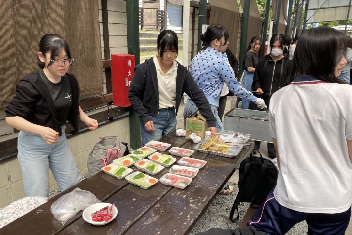 お昼はデイキャンプ場にて、クラスごとに分かれてのバーベキューを行いました。火おこしに苦戦したり、お肉の焼き加減など調理にこだわったりと、協力しながら準備を進める姿が印象的でした。青空の下でみんなと一緒に食べる食事は格別の味でした。