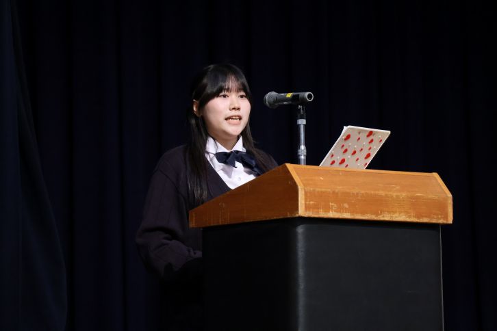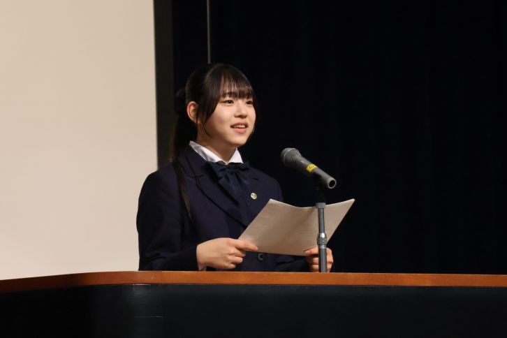 生徒スピーチでは、清水萌瑠さんが登壇。公立中学校から入学した自身の経験をもとに、椙高生の特徴として「自分の考えを持って発信できると同時に、相手の意見もしっかりと聞けること」を挙げ、本校での学校生活を通しての成長について語りました。