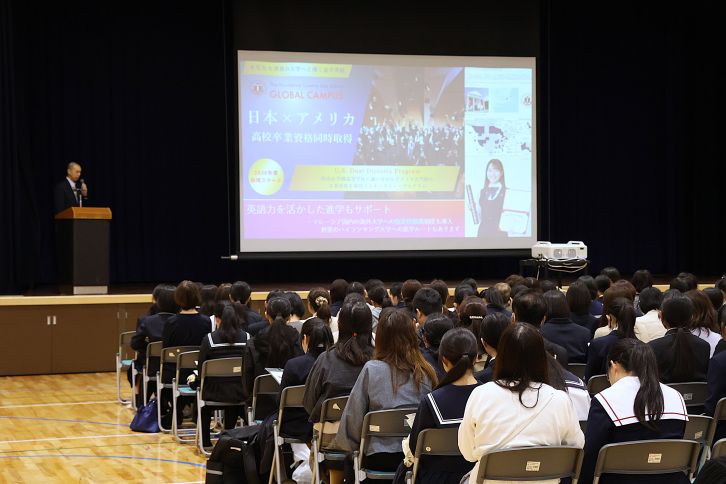 学校紹介では、全教科で展開している「調べ・まとめ・プレゼンする」という探究型の学びのスタイルや、英語教育への注力、体験を重視した“本物に触れる学び”について説明しました。あわせて、今年度から導入した高校教育と海外の教育を組み合わせた「U.S.デュアル・ディプロマ・プログラム」についても紹介。さらに進路説明では、マレーシアの大学の指定校推薦制度や、今年度から新たに導入した特色入試など、本校の新しい取り組みについて説明しました。