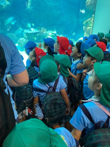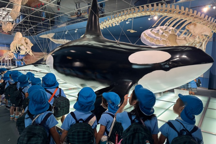 お弁当を食べた後にイルカショーを観て、イルカたちが次々繰り出す技に驚いていました。その後、館内を回り、海に住む生き物の可愛さ、面白さを感じて楽しむ様子がありました。