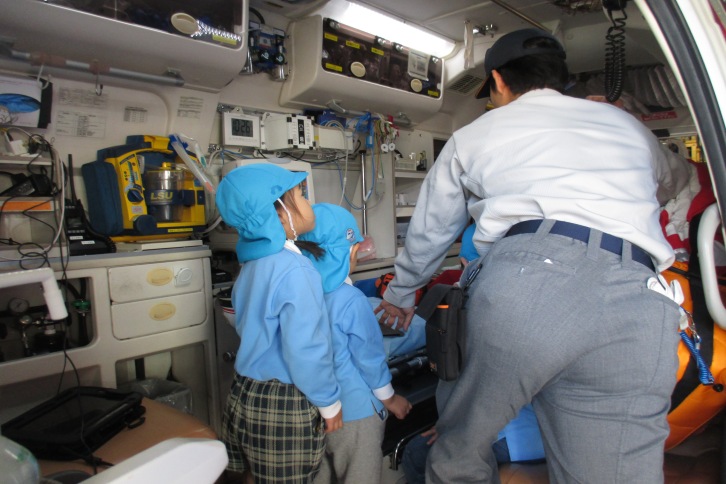 次に、消防車や救急車に乗せてもらい、色々な機器を見たり、説明を聞いたりしました。興味津々な様子でした。