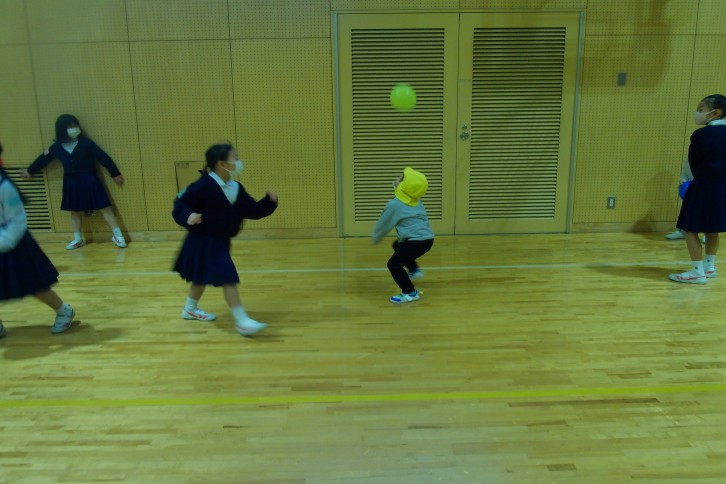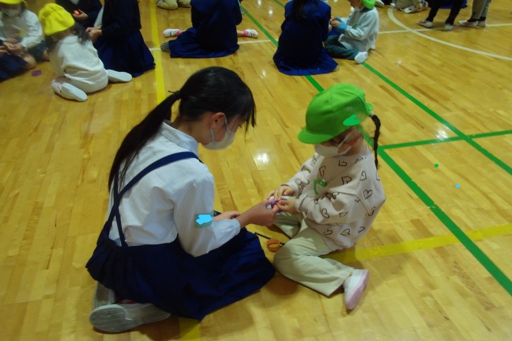 はじめに、3年生と年少児で少人数のペアを組んで、それぞれ自己紹介をしました。自己紹介のあと、一緒にストロー飛行機を作って飛ばしたり風船でバレーボールをしたりするうちに、緊張気味の子どもたちから、次第に笑顔が見られるようになりました。