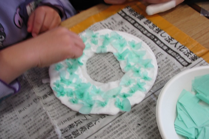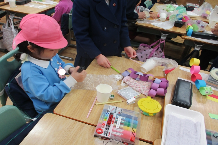 A組ともも組は紙コップを使ってトナカイ作り、B組とふじ組は紙粘土とお花紙でクリスマスリース作り、C組とゆり組は紙粘土のキーホルダー作りや折り紙での雪だるま作りをしました。その後、体育館に移動し、お姉さんたちの素敵な歌声を聴かせてもらい、最後にペアで踊りを踊りました。