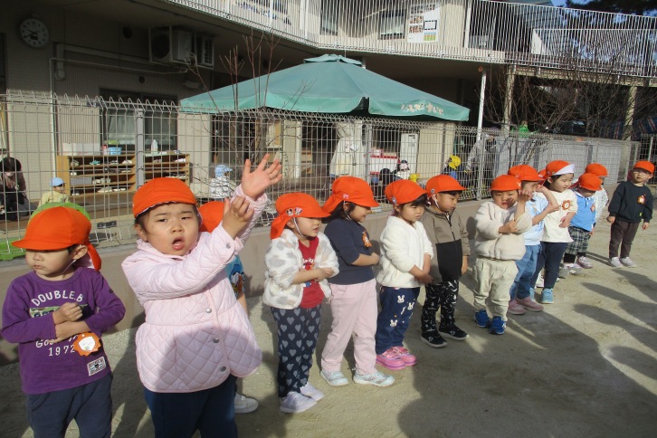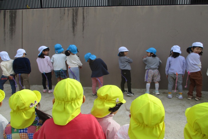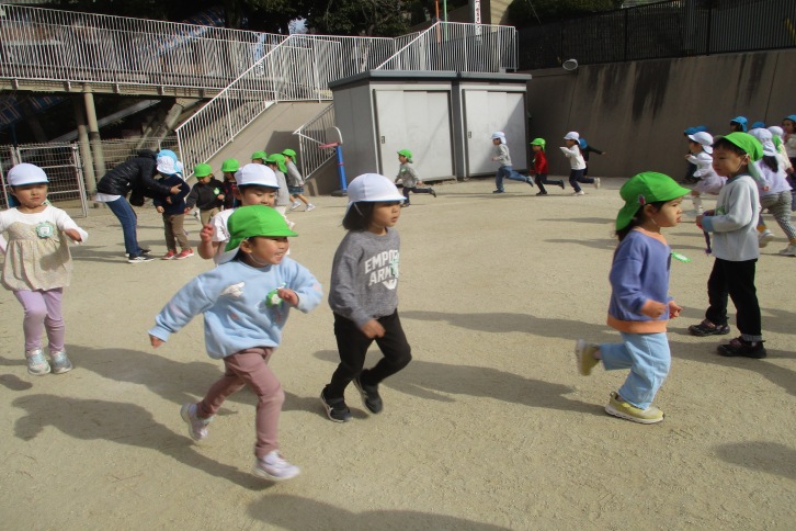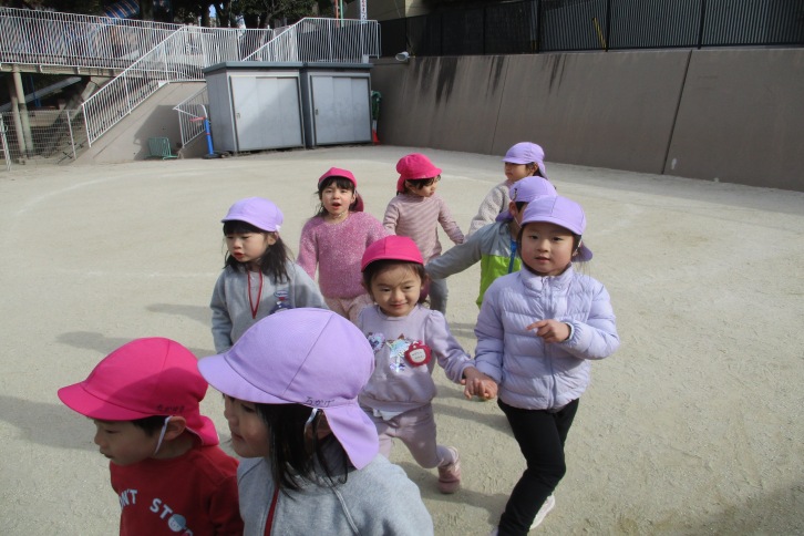 1月20日(火)にばら組ともも組、きく組とふじ組、すみれ組・れんげ組とゆり組が縦割り活動をしました。今回は年中さんにしっぽ取りを教えてもらい、年少さんが年中さんのしっぽを取ったり、年少対年中で勝負をしたりして楽しい時間を過ごすことができました。クラスまでお見送りをしてもらったクラスもあり、年少の子どもたちはお兄さん、お姉さんと遊んでもらうことができてとても嬉しそうでした。
