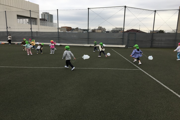 1月27日、年少組は、椙山小学校の人工芝の広場まで自分で作った凧をあげに行きました。人工芝の広場は、年少組の子どもたちにとって、とても広くて、第一声は「わ~、広い!」でした。幼稚園では経験できない長い直線を、元気よく駆け抜けていました。
