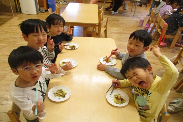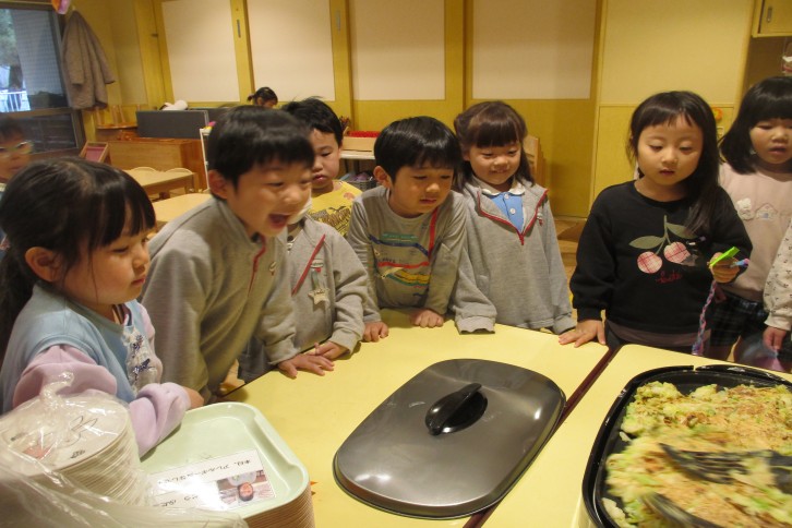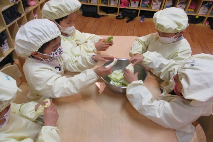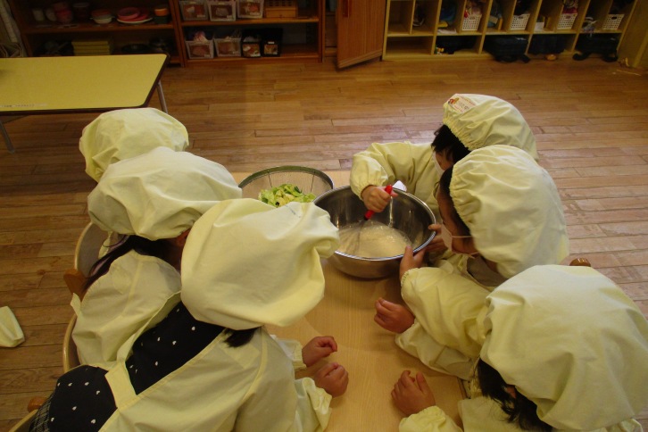2月25日にもも組とふじ組、27日にゆり組が、キャベツの調理をしました。今回、子どもたちは、キャベツを”ちぎる”、粉と水を入れて”混ぜる”を経験しました。教師がホットプレートで焼いていると「美味しそう」「いい匂い」と、ワクワクしていました。焼きたてを、友達と一緒に美味しそうに食べました。