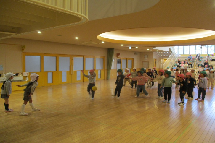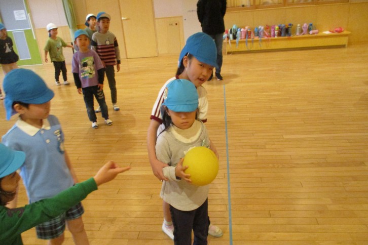 年長組が、この1年でとても上達したドッジボールを年中組に教えてくれることになりました。年中組は少し前にルールを聞いて、1~2回しただけなのでまだうまく進められません。年長児がボールの投げ方や外野・内野の違いなどを、一緒に行いながらわかりやすく説明してくれました。そのおかげで、年中児もかなりルールを理解し、とても楽しく参加することができました。この1年間での縦割りの活動で、異年齢のかかわりがぐっと深まりました。もうすぐ卒園の年長組も、もうすぐ最高学年になる年中組も、とてもよい思い出になってくれたことと思います。