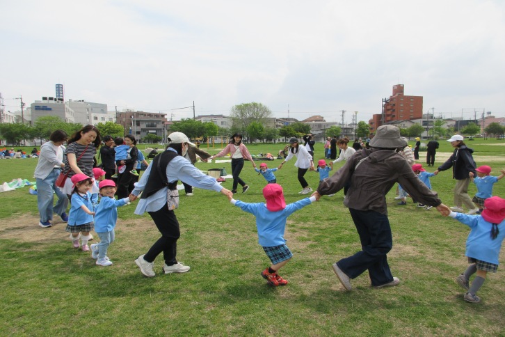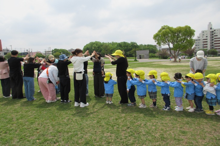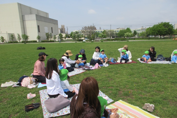 4月17日、年少組は川名公園へ遠足に行ってきました。初めにクラス写真を撮り、その後クラスごとに分かれて自己紹介をしました。自己紹介をした後は、ゲームを行い楽しく過ごしました。ゲームの後は待ちに待ったお弁当の時間!大好きなおうちの方や友達と一緒に食べ、笑顔が見られました。