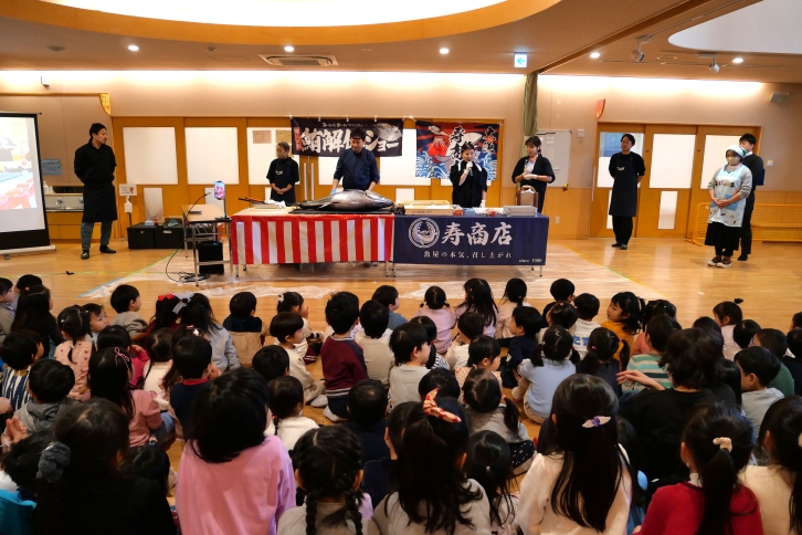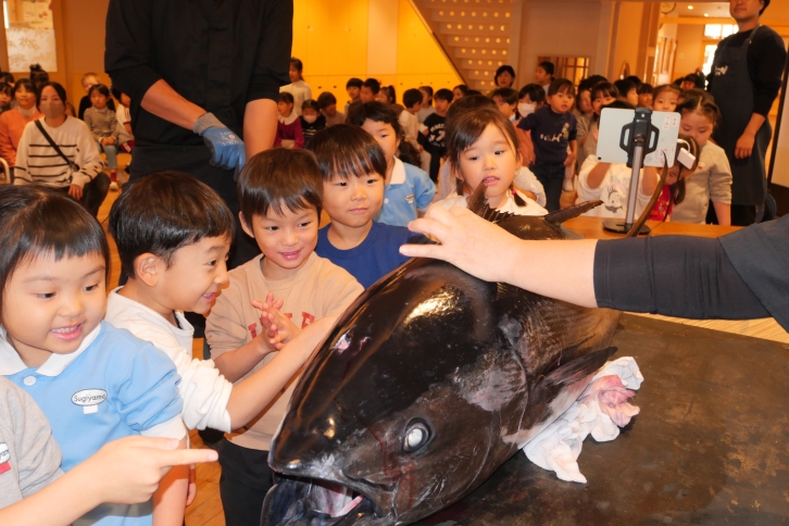 今回のイベントは、子どもたちが“本物にふれる体験”を通して、食べ物への関心や感謝の気持ちを育むことを目的に実施したものです。会場のホールに集まった子どもたちは大きなマグロを目近かに見て興味津々な様子でした。