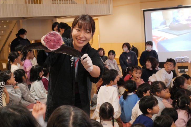 最初に寿商店の職人さんがマグロの生態について、丁寧に説明しました。「マグロはとても速く泳ぐこと」「マグロの種類」などの話が紹介されると、園児たちは驚きの声をあげながら熱心に耳を傾けていました。続いて、マグロの重量を予想するクイズを実施。「30キロ!」「100キロかも!」と、子どもたちなりの大胆な予想が飛び交い、会場は楽しい雰囲気に包まれました。