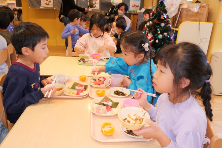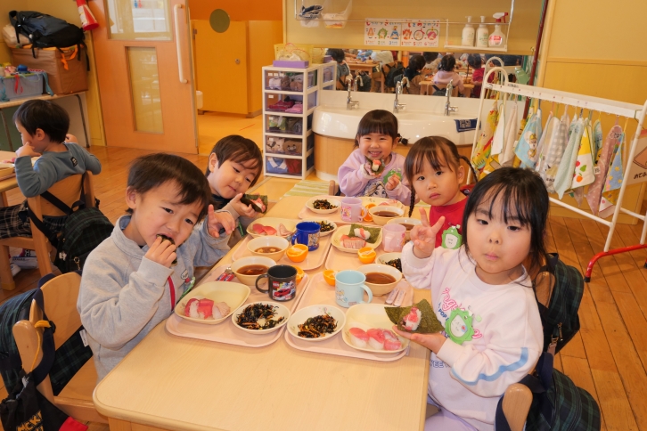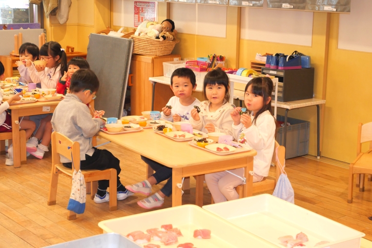 イベント終了後、園児たちは各クラスへ戻り、職人さんが握ってくださった寿司をいただきました。自分たちの目で見て学んだマグロを「おいしいね」と言いながら味わった経験からはいつも食べているものへの理解や関心が育っていくことでしょう。
