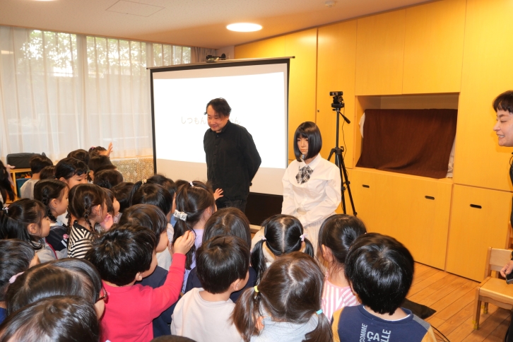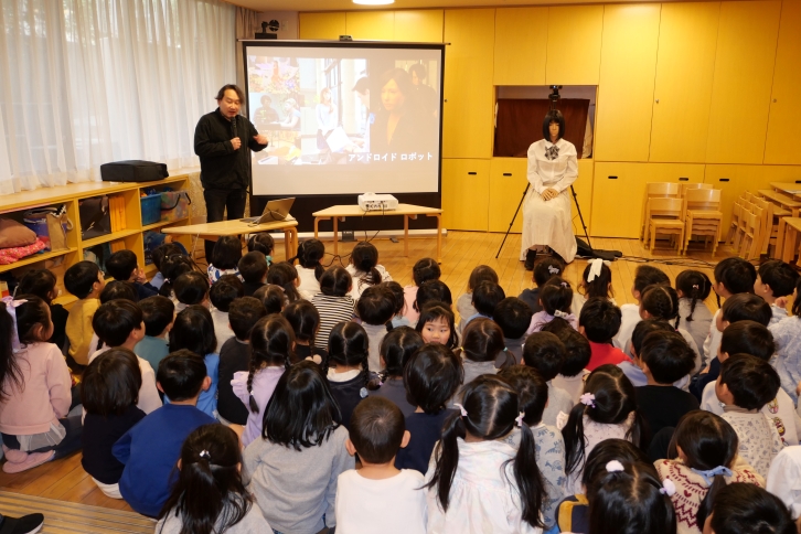 会場に登場したロボットが自然な声で話し始めると、子どもたちからは驚きの声が上がりました。まばたきしたり、口を動かしたりしながら会話をする様子は非常にリアルで、子どもたちは思わず前のめりになって見入っていました。途中、実際に園児がロボットに質問を投げかけ、ロボットがそれに答える場面もあり、会場は和やかな雰囲気に包まれました。