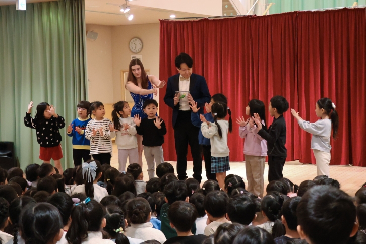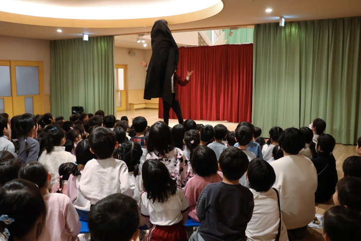 ショーの最後は、今まで園児たちの目の前にいたアシスタントの女性が消え、みんなが座っている後ろから登場!園児たちは驚きの声を上げながら大きな拍手を送り、大興奮の中マジックショーは終了しました。