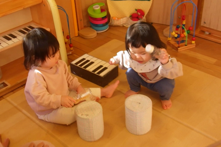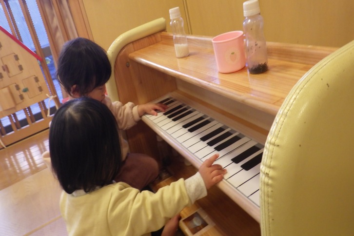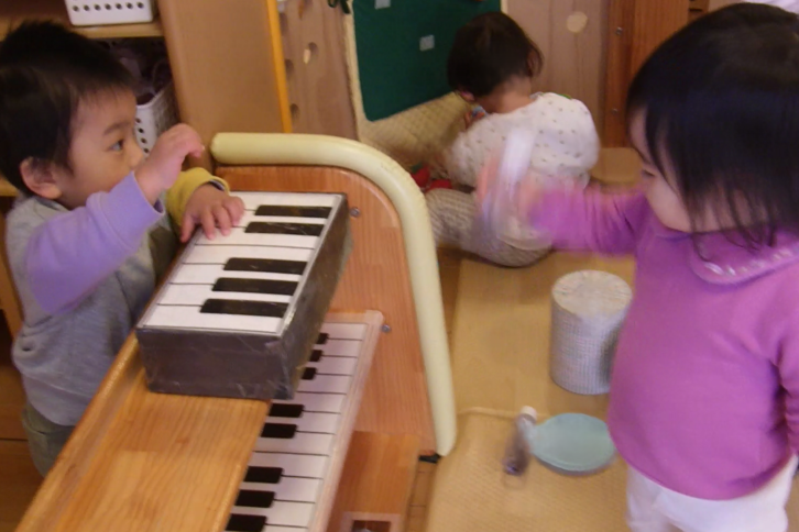 保育者が「おもちゃのチャチャチャ」の歌を歌うと、一緒に歌いながら手作りのマラカスや太鼓を鳴らしたり、棚板を鍵盤のように指で叩いたりと笑顔でリズムをとり始める子ども達の姿から、空き箱や棚に鍵盤を貼ってみました。さっそく “トントン”と手首を動かしてピアノを弾く様子が見られました。音が鳴るというだけでワクワクが広がり、思わず体が動き出す、そんな子ども達の姿を大切にしながら、保育者と一緒にさまざまな音あそびを楽しんでいます。