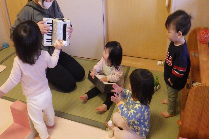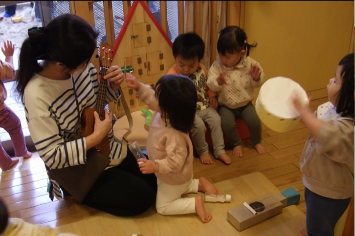 最近では、友達が鳴らす音に合わせて自分の楽器を鳴らしたり、体を揺らしたりしながら顔を見合わせて笑い合う姿も増えてきました。 “音が出た”“もう一回やってみたい”という気持ちが、好奇心につながり、保育者や友達と気持ちを共有するきっかけにもなっています。言葉だけではなく、目線や表情、体の動きで“楽しいね”“おもしろいね”と伝えようとする姿を大切にしながら、子ども達の豊かな表現力を育てていきたいです。