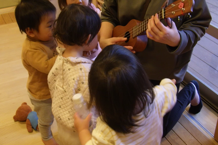 保育者がウクレレを弾くと様子をじっと見つめたあと、自分でも弦に触れてみようと指を伸ばし興味津々。弦を弾いて音が鳴ると目を丸くして驚いたり、場所によって違う音が出ることに気づいて友達と顔を見合して笑顔になったり… そこで紙皿や空き箱に輪ゴムを付けて作った手作りのウクレレを用意してみると、保育者のウクレレの音に合わせて、一緒にゴムを弾きながら体を揺らす子ども達でした。