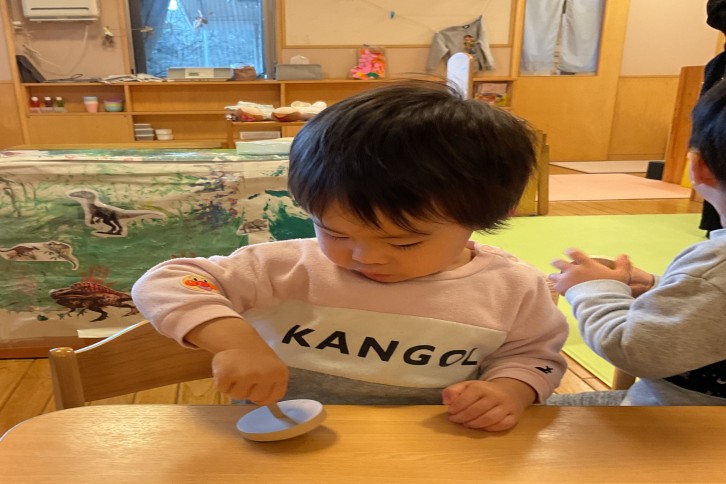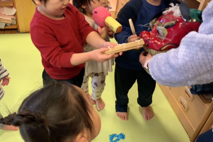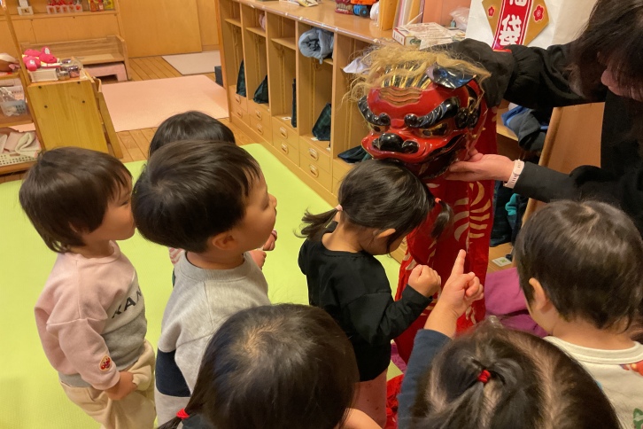 お獅子さんが音楽に合わせて子どもたちのところに来て、お正月ごっこがあることを知らせに来てくれました。少し怖くて遠くから見ている子、「おししさん?これたべる?」とごはんを口に入れたり、お化粧セットを持ってきて、筆や櫛を使って顔にお化粧をしたり髪をなでたりしてお獅子さんに興味津々の子どもたちでした。保育者が「お獅子さんに頭をかじってもらうと健康になれますよ」と声を掛けると積極的に頭を差し出してかじってもらっていました。