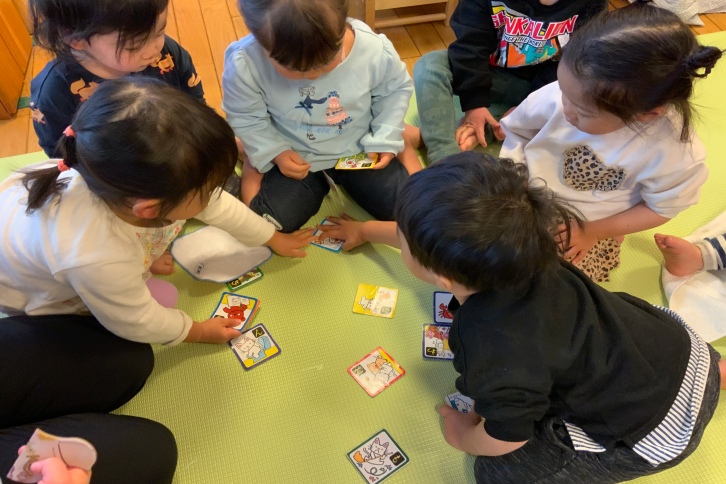 いつも遊んでいるメモリーカードとは違い、保育者が読み上げた言葉を聞きとり、絵と結び付けて取ります。子どもたちは真剣に絵札を見渡し、「みつけた!これだよ。」と勢いよく手を伸ばしていました。何回か繰り返すと、ルールを理解し「もういっかいやろう」と楽しむ姿が見られました。