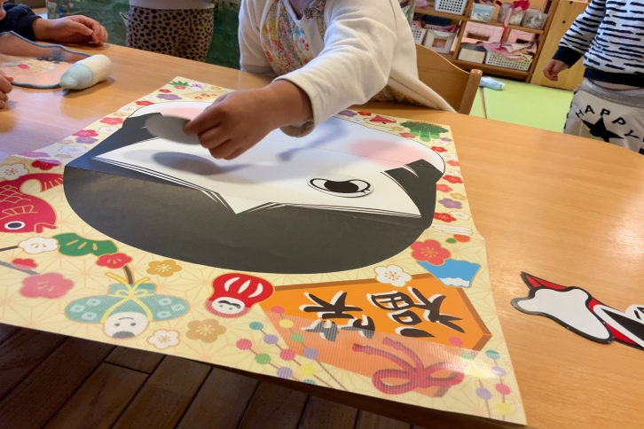福笑いでは友達に「ちがう、ちがう。もっとこっちだよ」と教えてもらいながら顔のパーツを左右上下に動かし完成。目を開けると「あれ?」と友達と顔を見合わせて笑っていました。