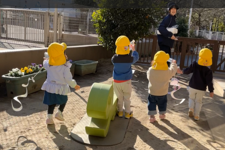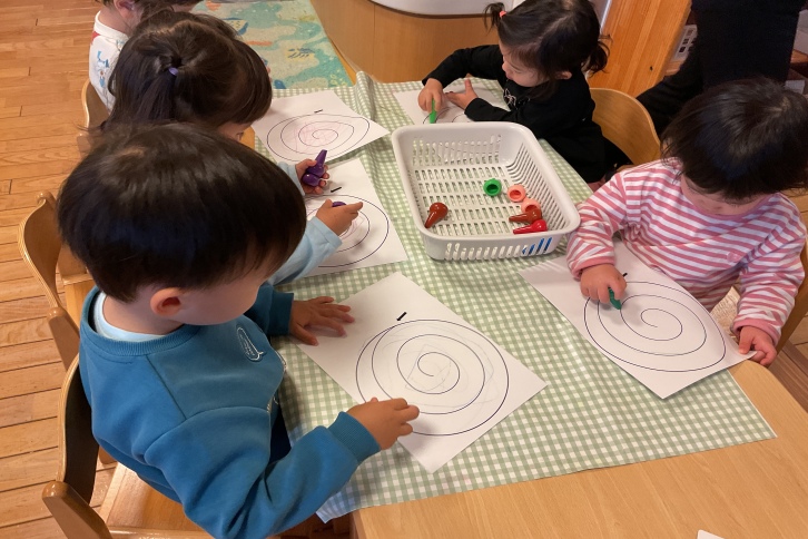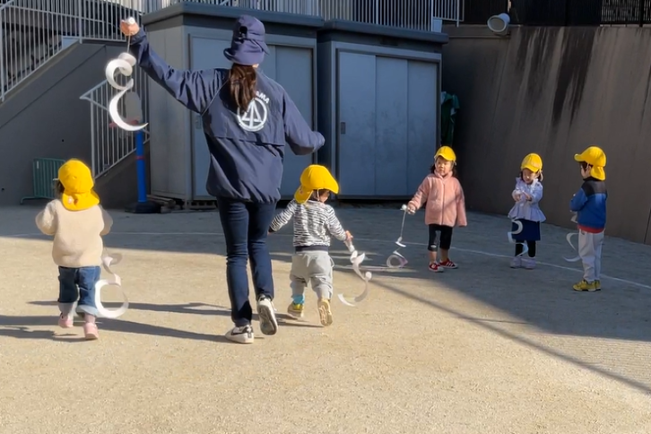 うずまきが描いてある台紙に好きな色を使って描画をしました。「これがたこになるの?」と不思議そうな表情の子どもたち。翌日、できあがった凧を見ると「わー、へびさんみたい!」「はやくそとにいこうよ」と張り切って園庭に出ていきました。走ると同時に凧がくるくると回り「もっとはしろう」と園庭中を走って凧あげを楽しみました。