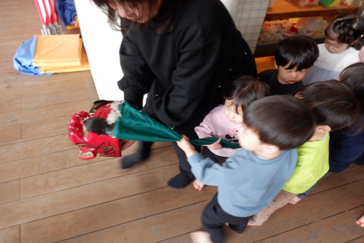子どもたちがお正月ごっこで登場するお獅子さんにびっくりしないように、そして親しめるように毎日小さな獅子の「お獅子さん」を持って保育室に来てくれた園長先生。最初はドキドキしていた子どもたちでしたが、次第に興味を持つ子も出てきて、獅子にカップっと噛んでもらいに行く子がでてきたり、テラスで獅子と一緒に練り歩くことを楽しんだりしました。