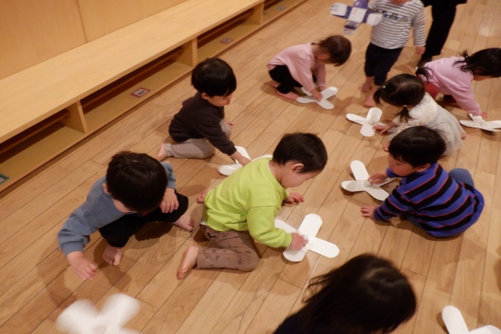 コマ回しでは指先でキャップをつまんで手首をひねり自分の力でうまく回せると「みて」と、くるくる回るコマが嬉しくて何度も回して楽しんだ子どもたちです。