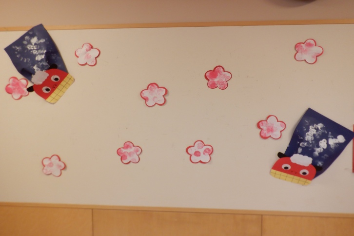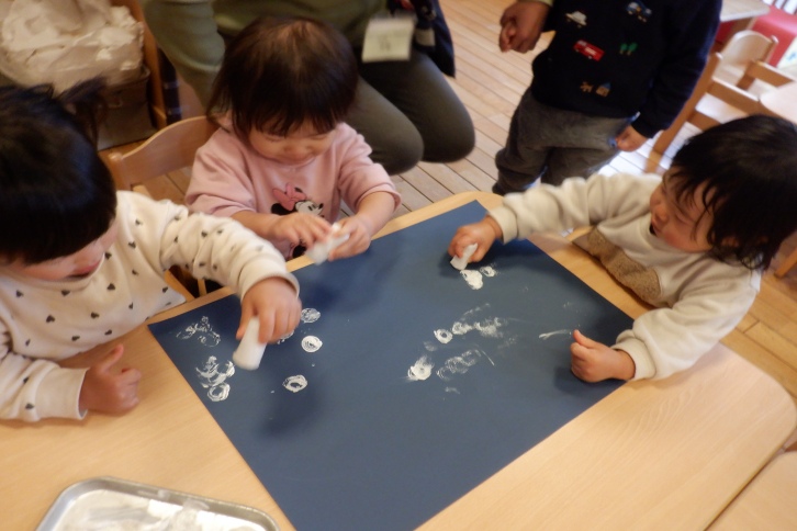 スポンジを丸めて作ったスタンプを紙に押すと、くるくる模様がつくことが嬉しくて、何度も何度もぺったんと押したり、伸ばしたり。スタンプ遊びを楽しんだものをお獅子の被り布に見立てて保育室に飾りました。飾った獅子を見て「ししまいさんがみてる」と興味を持っている様子が伺えました。