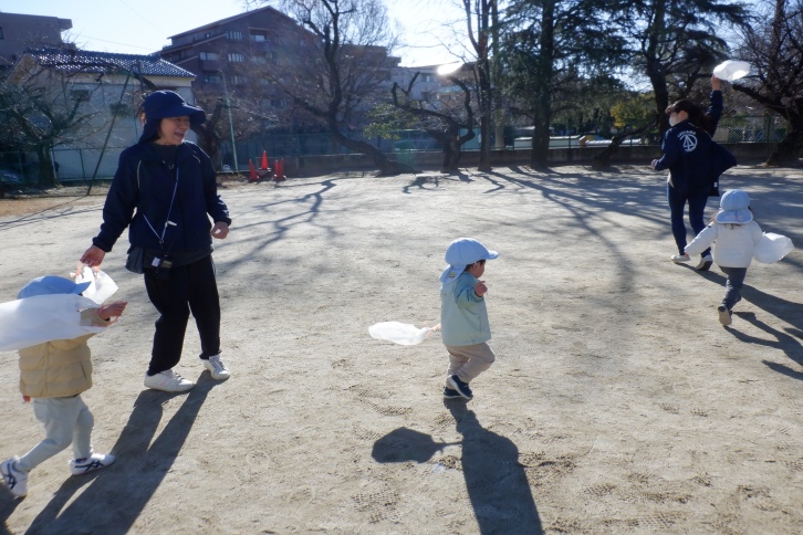 戸外ではビニール袋で作った凧揚げも楽しみました。保育者が走って見せると、真似て走り出す子どもたち。「手を上にあげると良いよ」と伝えると、手を一生懸命高くして走る子や、手をあげることは難しくても手に持って走ることを喜ぶ姿が見られました。
