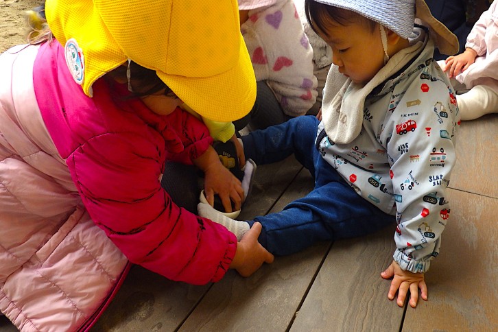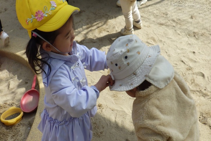 園庭にも春の暖かさが広がり、子ども達は戸外での遊びを活発に楽しんでいます。園庭遊びの中ではぶどう組の子ども達が優しく関わってくれる姿が多く見られます。靴を履かせてもらったり、落ちた帽子をそっとかぶせてもらったりと、ぶどう組の子ども達のこうした優しい関わりに安心した表情を見せたり、笑顔を返したりと、心のやり取りが少しずつ育ってきています。