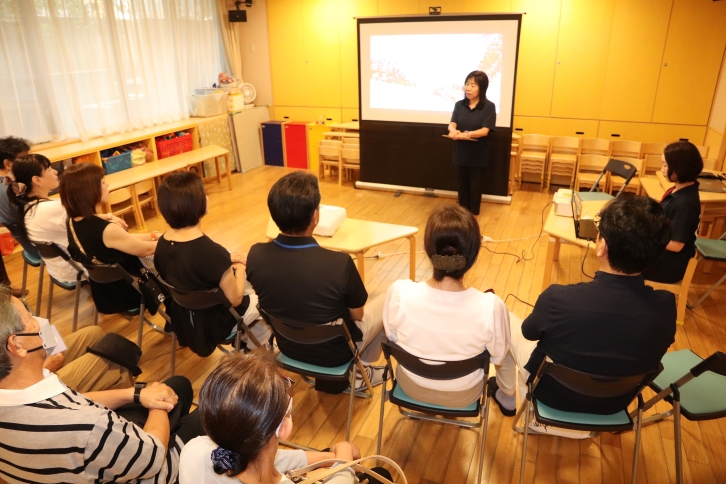 最初に、園児の日常生活を写したスライドショーの映し、お孫さんたちの笑顔や遊びの様子を観て、祖父母の皆さまからは思わず笑みがこぼれていました。