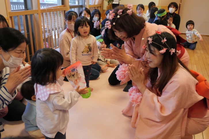 踊りのあと、お花の形のお菓子をいただきました。春らしい彩りに、子どもたちは満面の笑みを浮かべていました。