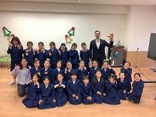 2学期の英語プレゼンテーションを行いました。最初に「If You`re Happy and You Know It」を振りも付けて、みんなで楽しく歌いました。次の「Introduction」では、友達の好きなものや好きなことなどを紹介し合いました。そして、「Doctors Skit」では、医者と患者の役に分かれて、短い劇をしました。その後、「Left & Right」を元気よく歌って踊りました。最後の「Santa Quiz」では、グループごとに絵を見せながらサンタクロースやクリスマスに関する問題を出しました。張り切って手を挙げて答えを発表する子どもたちの姿も印象的でした。子どもたちの笑顔あふれる英語プレゼンテーションでした。