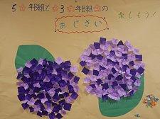 長い休み時間に3年生と5年生で折り紙のアジサイをつくりました。初めての交流だったので緊張している様子も見られましたが、協力してつくるうちに、笑顔で、楽しそうに交流する姿が見られるようになりました。力を合わせて完成させた5年生と3年生のアジサイの花で廊下が明るく華やかになりました。
