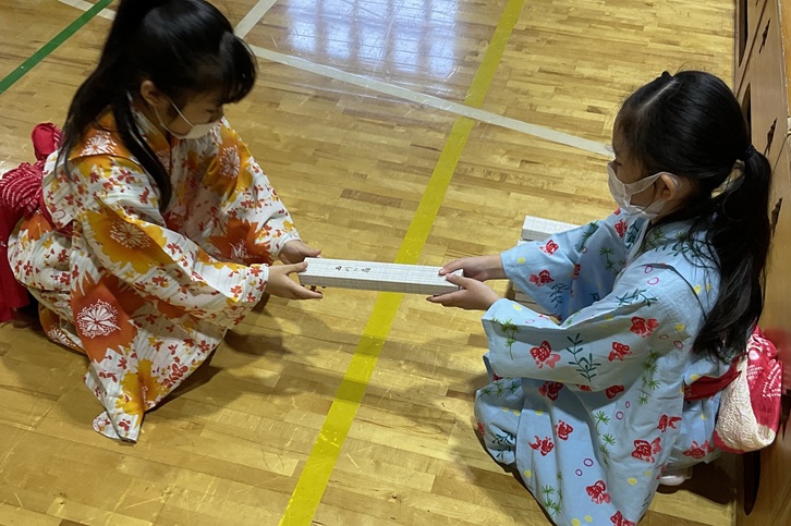 今回が最後の日本舞踊体験ということで、お辞儀の仕方や浴衣の着方、扇子の受け渡し方、踊り方などを一つ一つおさらいしました。